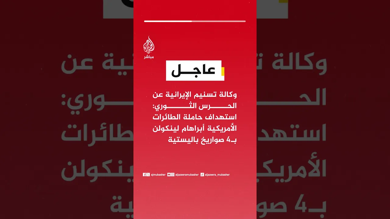وكالة تسنيم عن الحرس الثوري: استهداف حاملة الطائرات الأمريكية أبراهام لينكولن بـ4 صواريخ باليستية