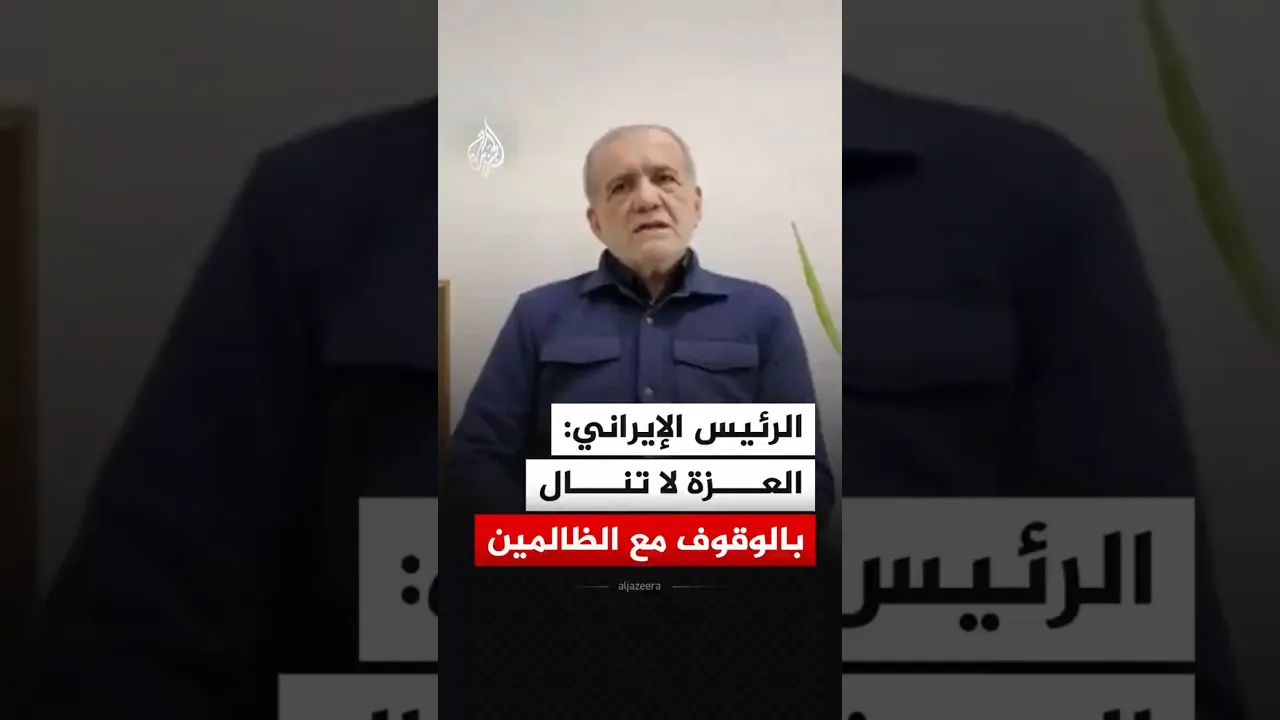 الرئيس الإيراني مسعود بزشكيان يدعو الإيرانيين إلى الوحدة مؤكدا أنه لا يمكن لأي إيراني دعم إسرائيل التي تقتل الجميع معتبرا أن وضع العالم في أيدي القتلة أمر مؤسف وأن العزة والقوة لا تنال بالوقوف إلى جانب الإمبرياليين والظالمين.