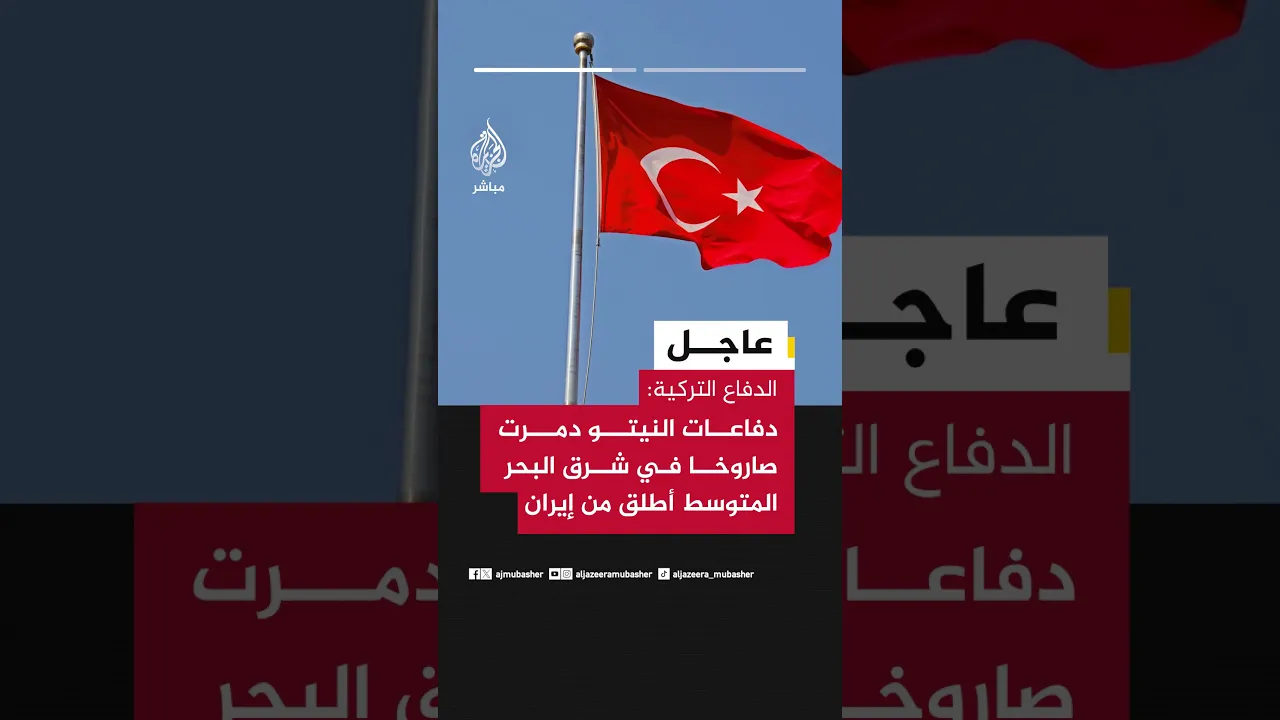 عاجل | الدفاع التركية: دفاعات النيتو دمرت صاروخا باليستيا في شرق البحر المتوسط أطلق من إيران