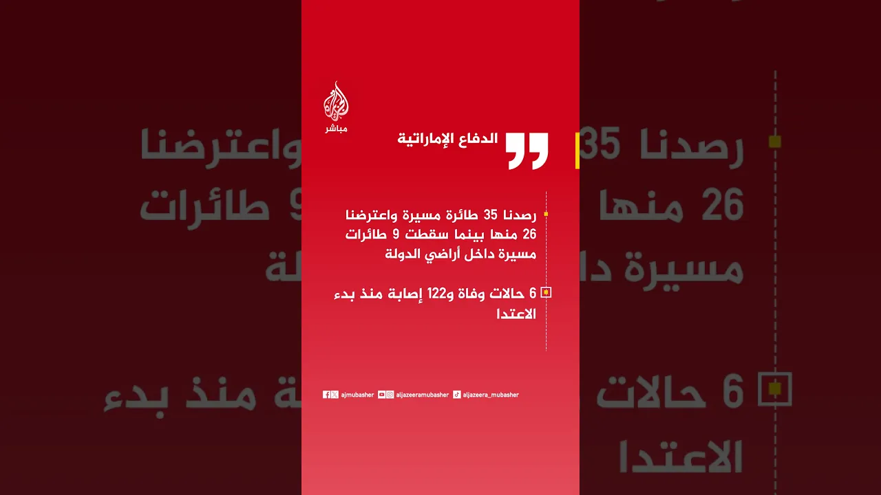 الدفاع الإماراتية: رصدنا 35 طائرة مسيرة واعترضنا 26 منها بينما سقطت 9 طائرات مسيرة داخل أراضي الدولة