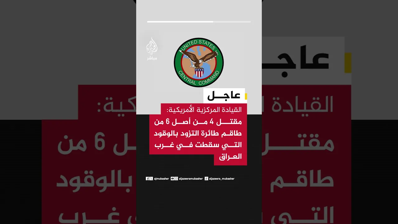 عاجل | القيادة المركزية الأمريكية: مقـ ـتـل 4 من أصل 6 من طاقم طائرة التزود بالوقود التي سقطت في غرب #العراق