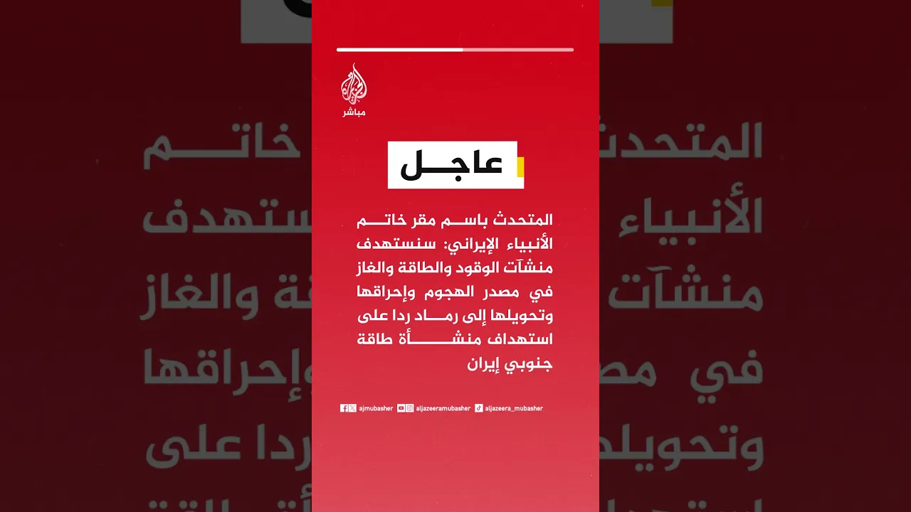 عاجل | المتحدث باسم مقر خاتم الأنبياء الإيراني: سنستهدف منشآت الوقود والطاقة والغاز في مصدر الهجوم وإحراقها وتحويلها إلى رماد ردا على استهداف منشأة طاقة جنوبي #إيران