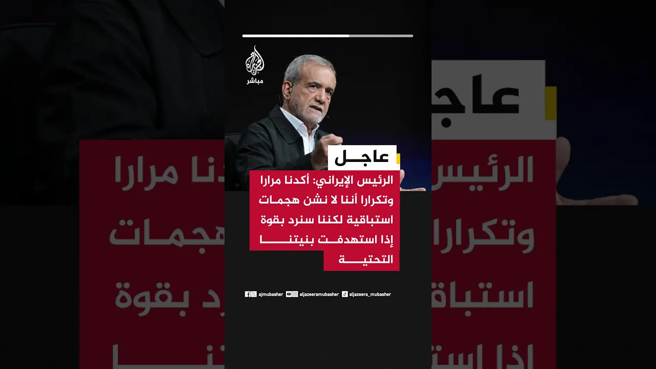 عاجل | الرئيس الإيراني: أكدنا مرارا وتكرارا أننا لا نشن هجمات استباقية لكننا سنرد بقوة إذا استهدفت بنيتنا التحتية