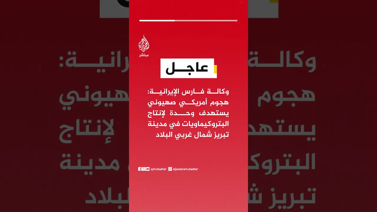 عاجل | وكالة فارس الإيرانية: هجوم أمريكي صهيوني يستهدف وحدة لإنتاج البتروكيماويات في مدينة تبريز