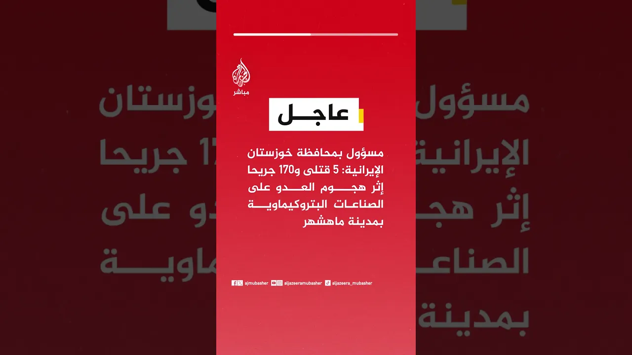 عاجل | مسؤول بمحافظة خوزستان الإيرانية: 5 قتلى و170 جريحا إثر هجوم العدو على الصناعات البتروكيماوية بمدينة ماهشهر