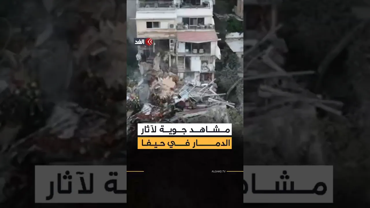 مشاهد جوية تظهر آثار الدمار الذي أصاب مبنى في حيفا جراء إصابته بصاروخ باليستي نتج عنه سقوط إصابات