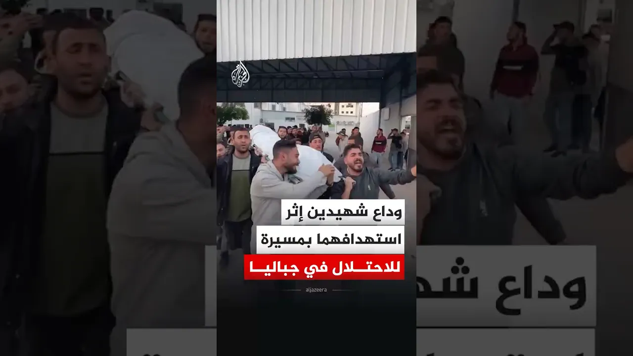 مشاهد توثق وداع شهيدين إثر استهدافهما بمسيرة للاحتلال قرب مستشفى اليمن السعيد في جباليا شمالي قطاع غزة