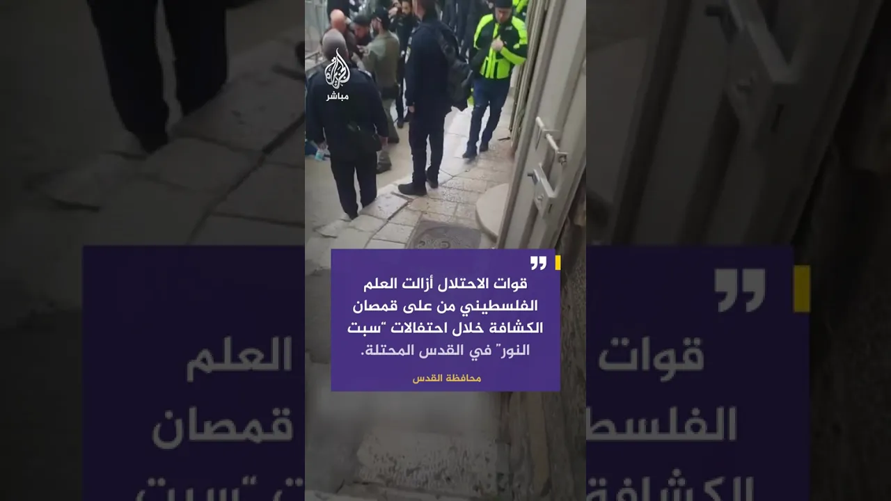 مشاهد لاعتداء قوات الاحتلال الإسرائيلي على أحد عناصر الكشافة الفلسطينية خلال احتفالات "سبت النور" قبل انتزاعها العلم الفلسطيني عن الزي الكشفي، حسبما أكدت محافظة القدس.