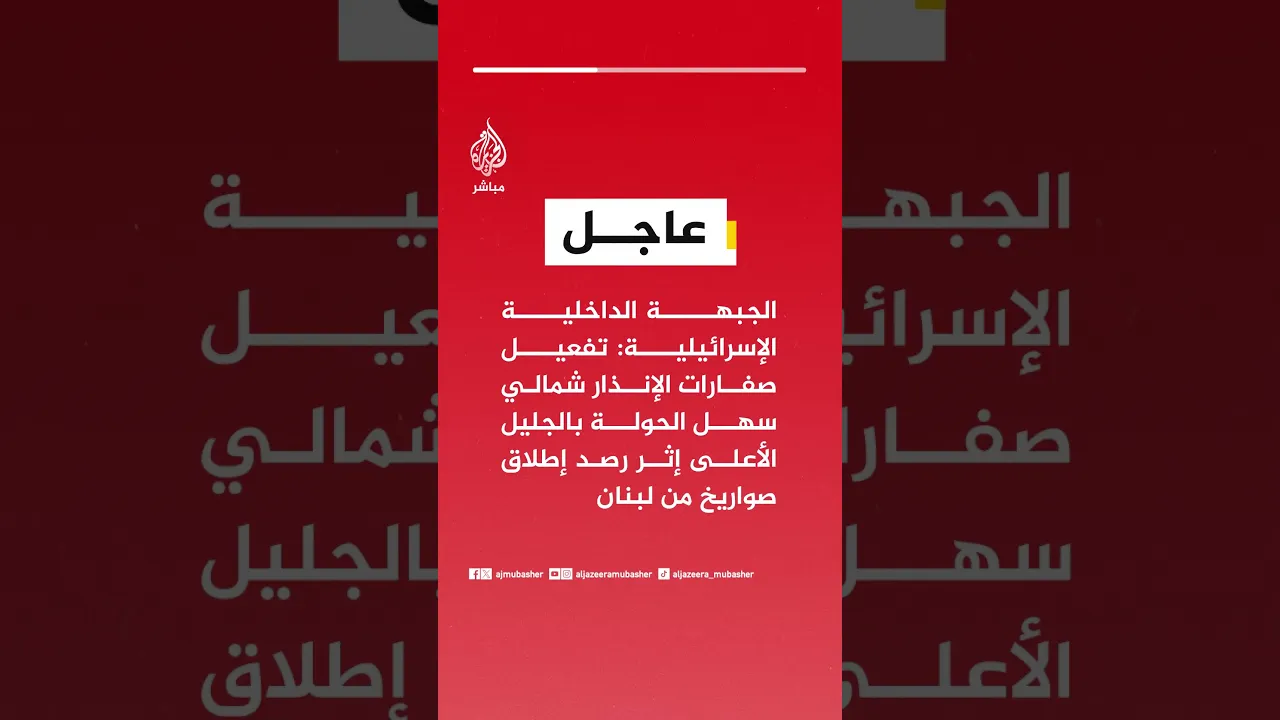 عاجل | الجبهة الداخلية الإسرائيلية: تفعيل صفارات الإنذار شمالي سهل الحولة بالجليل الأعلى إثر رصد إطلاق صواريخ من لبنان