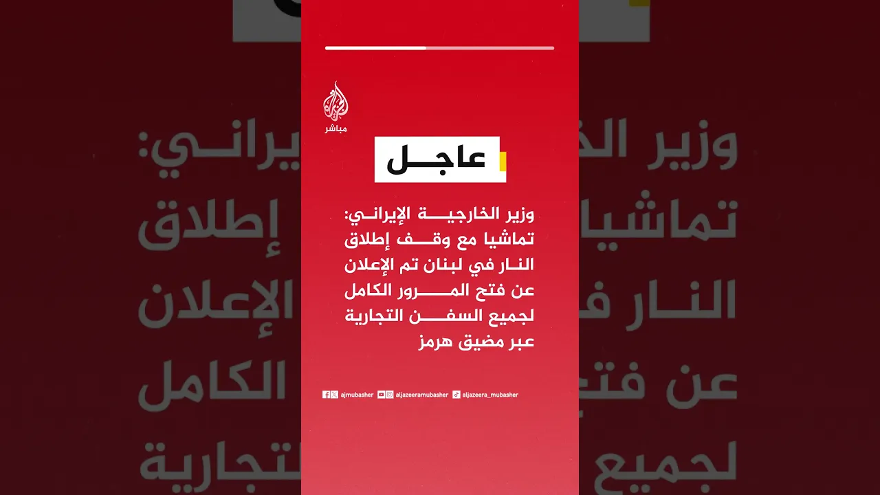 #عاجل | وزير الخارجية الإيراني: تماشيا مع وقف إطلاق النار في #لبنان تم الإعلان عن فتح المرور الكامل لجميع السفن التجارية عبر #مضيق_هرمز