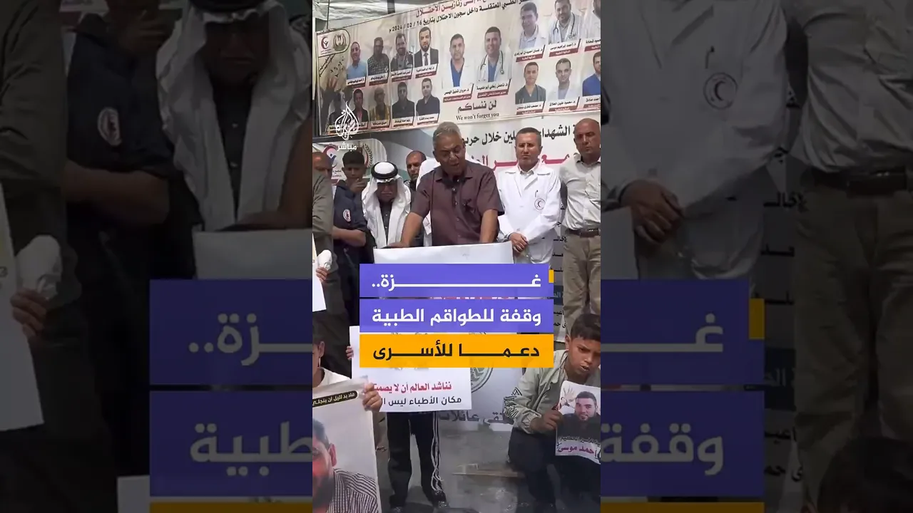 وقفة نظمتها الطواقم الطبية في مجمع ناصر الطبي غرب خانيونس تضامنا مع الأسرى من الكوادر الطبية في سجون الاحتلال