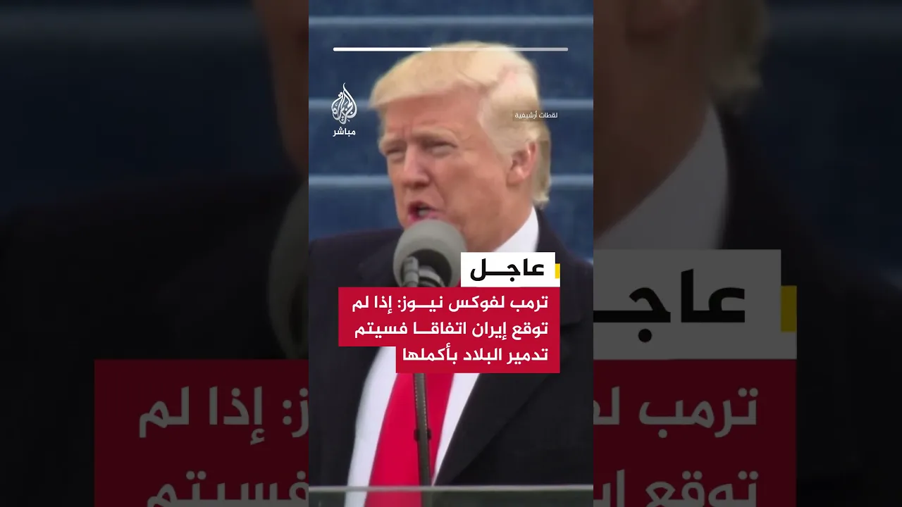 عاجل | ترمب لفوكس نيوز: إذا لم توقع إيران اتفاقا فسيتم تدمير البلاد بأكملها