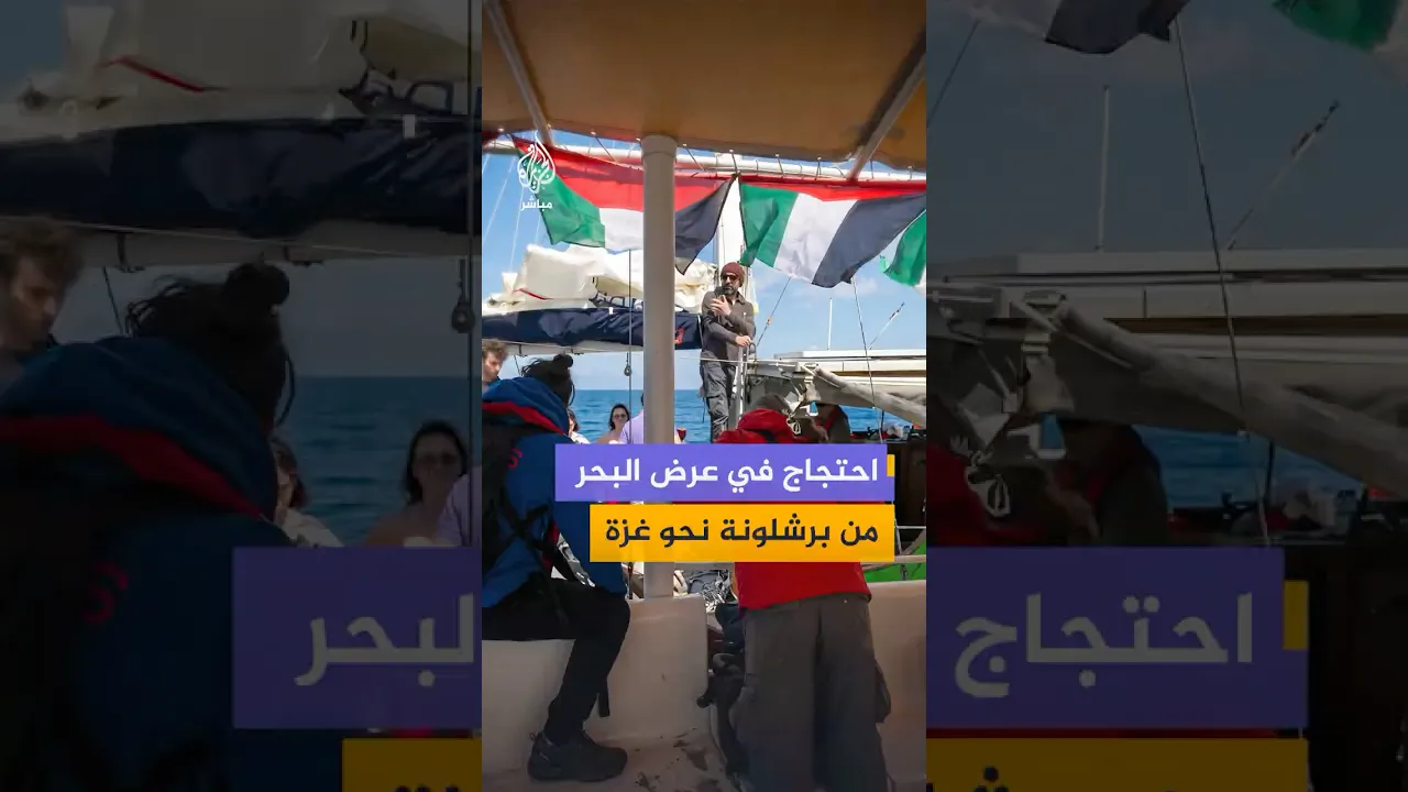 رفعوا أعلام فلسطين وهتفوا لغزة.. نشطاء أسطول الصمود ينفذون احتجاجا من برشلونة نحو غزة، عند التقاء سفنهم بسفينة حاويات متجهة إلى ميناء أسدود الإسرائيلي في عرض البحر