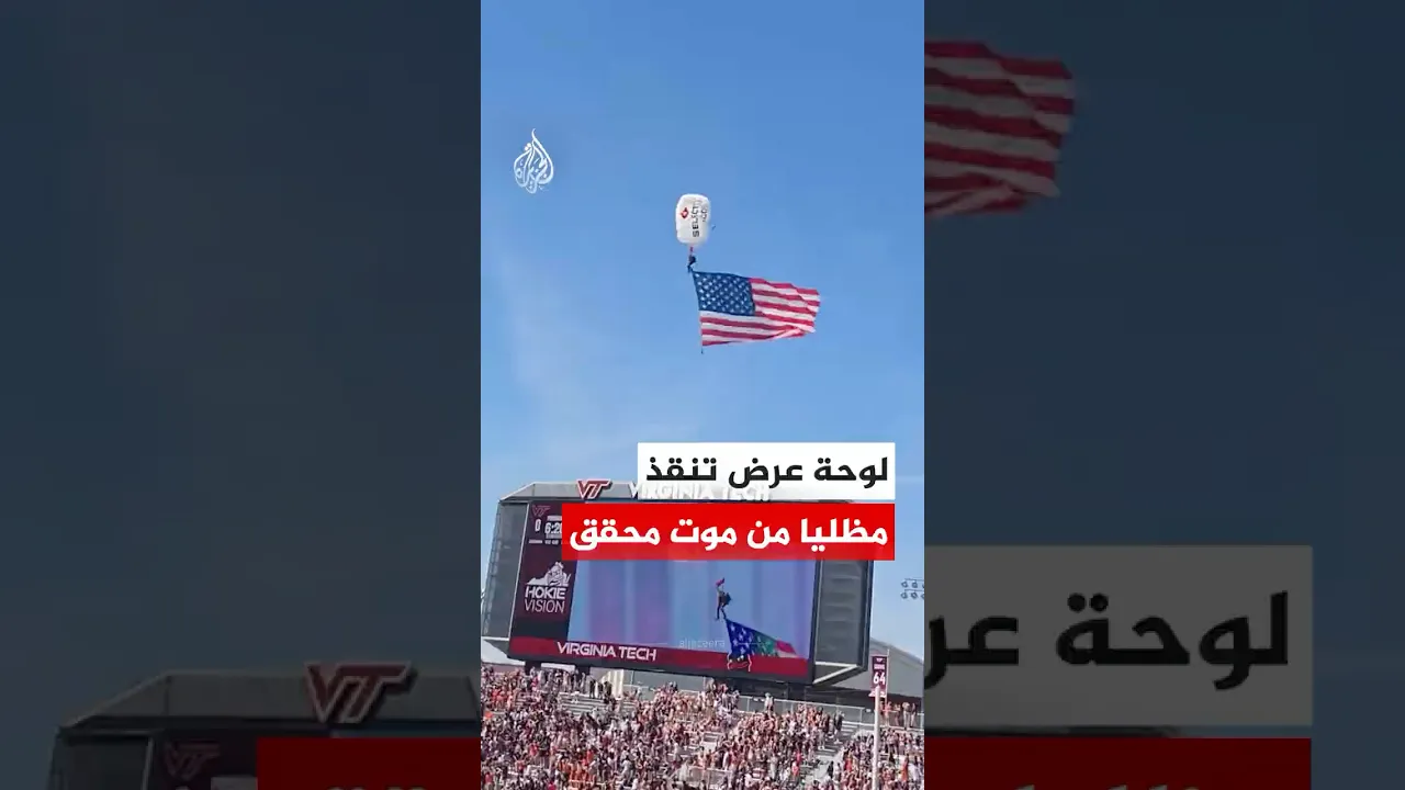 لحظة اصطدام مظلي بلوحة عرض النتائج في ملعب "لين" بمدينة بلاكسبيرغ في ولاية فيرجينيا الأمريكية، قبيل انطلاق مباراة كرة القدم الأمريكية لفريق جامعة فيرجينيا تك
