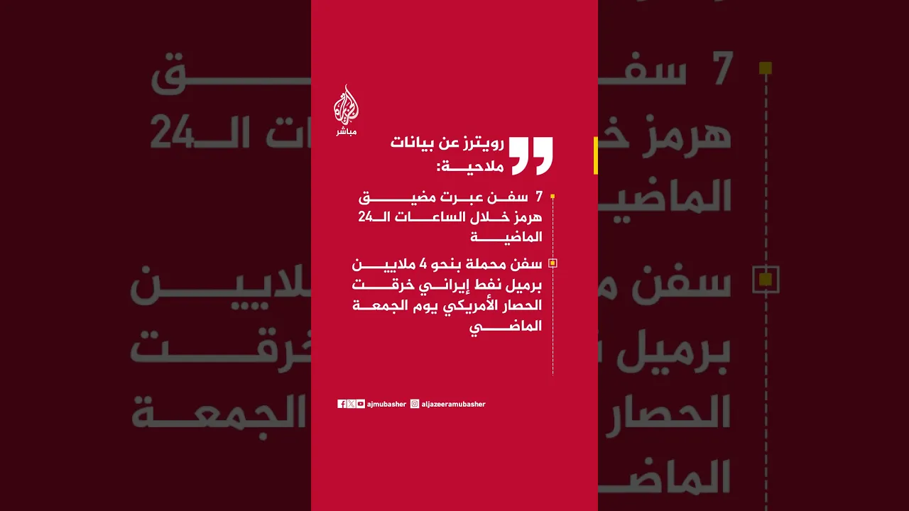 رويترز عن بيانات ملاحية: 7 سفن عبرت مضيق هرمز خلال الساعات الـ24 الماضية