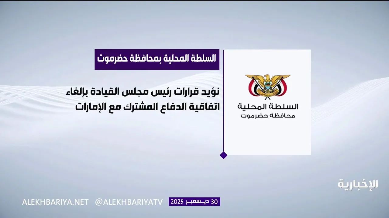 أعلنت السلطة المحلية بمحافظة حضرموت، التأييد الكامل لقرارات رئيس مجلس القيادة بإلغاء اتفاقية الدفاع المشترك مع الإمارات وإخلاء كافة القوات التابعة لها من الأراضي اليمنية.