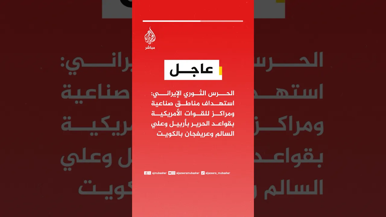 عاجل | الحرس الثوري الإيراني: استهداف مناطق صناعية ومراكز للقوات الأمريكية بالكويت