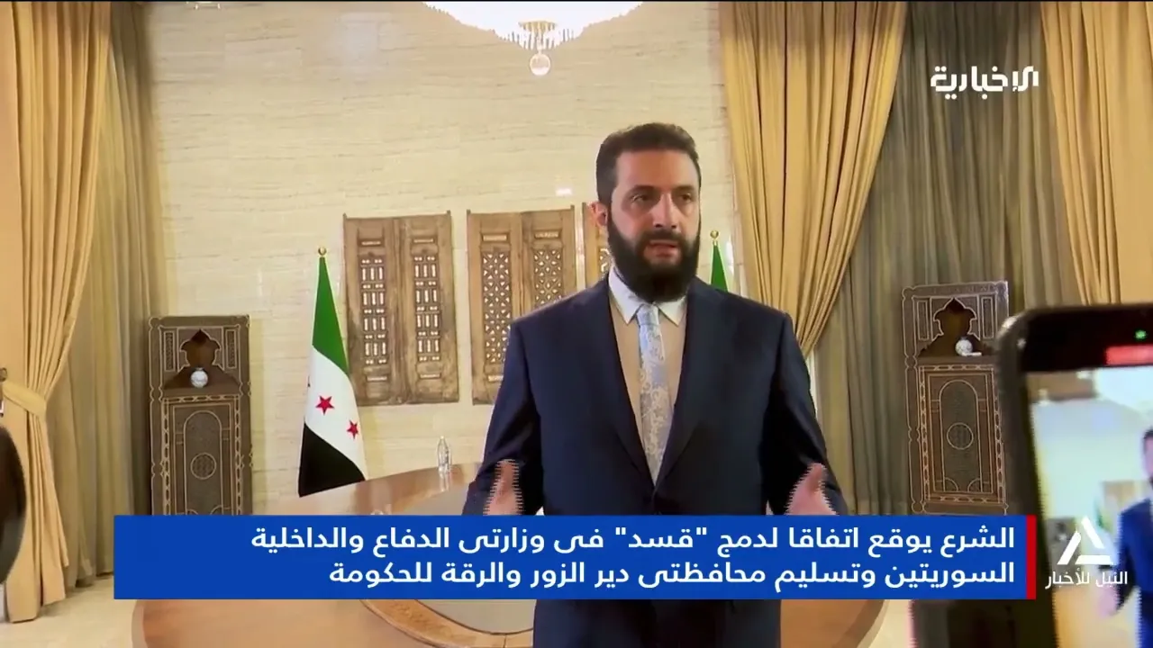 تقرير .. الشرع يوقع إتفاقاً لدمج قسد فى وزارتى الدفاع والداخلية السوريتين وتسليم محافظتى دير الزور والرقة للحكومة