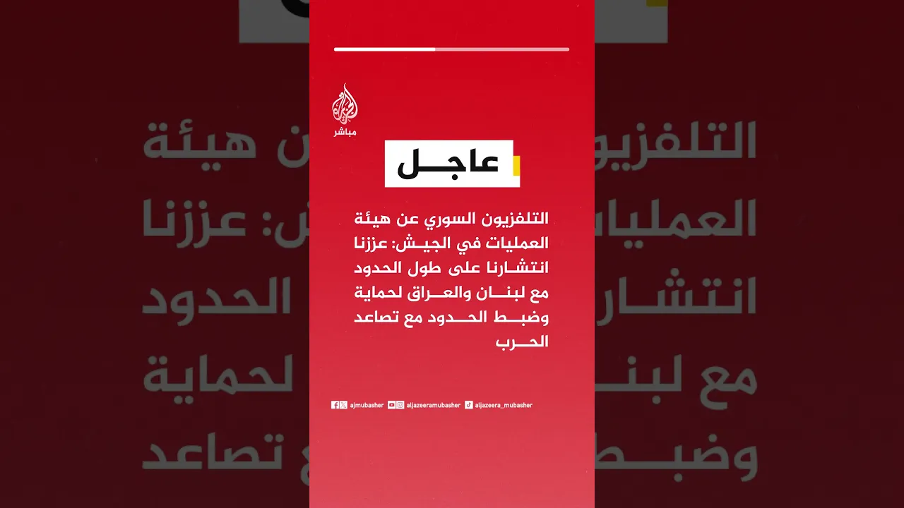 عاجل | التلفزيون السوري عن هيئة العمليات في الجيش: عززنا انتشارنا على طول الحدود مع لبنان والعراق لحماية وضبط الحدود مع تصاعد الحرب