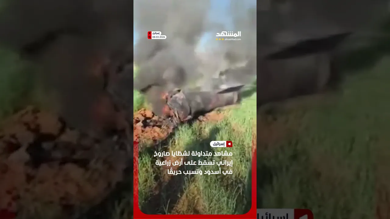 مشاهد متداولة لشظايا صاروخ إيراني تسقط على أرض زراعية في أسدود وتسبب حريقًا #اخبار_المشهد