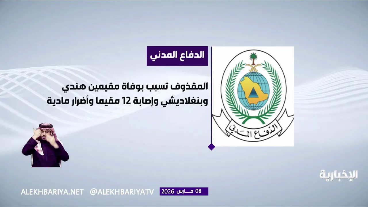 الدفاع المدني: سقوط مقذوف عسكري على موقع سكني لإحدى شركات الصيانة والنظافة بمحافظة الخرج نتج عنه حالتا وفاة من الجنسيتين الهندية والبنغلاديشية وإصابة 12 مقيمًا من الجنسية البنغلاديشية وأضرار مادية