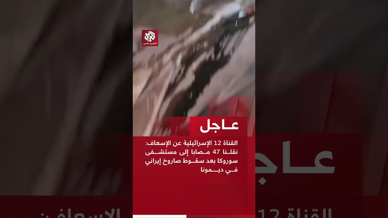 القناة 12 الإسرائيلية عن الإسعاف: نقلنا 47 مصابا إلى مستشفى سوروكا بعد سقوط صاروخ إيراني في ديمونا