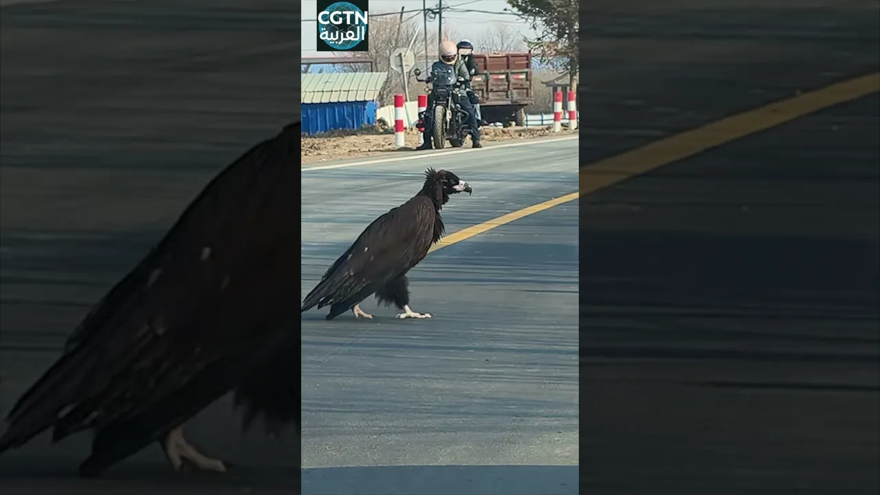 انتشر مؤخرا فيديو من الطريق الوطني في هونتشون بمقاطعة جيلين، يظهر نسرا أصلع، يمشي بهدوء في منتصف الطريق، بطول يقارب مترا وجناحين يتجاوزان مترين.