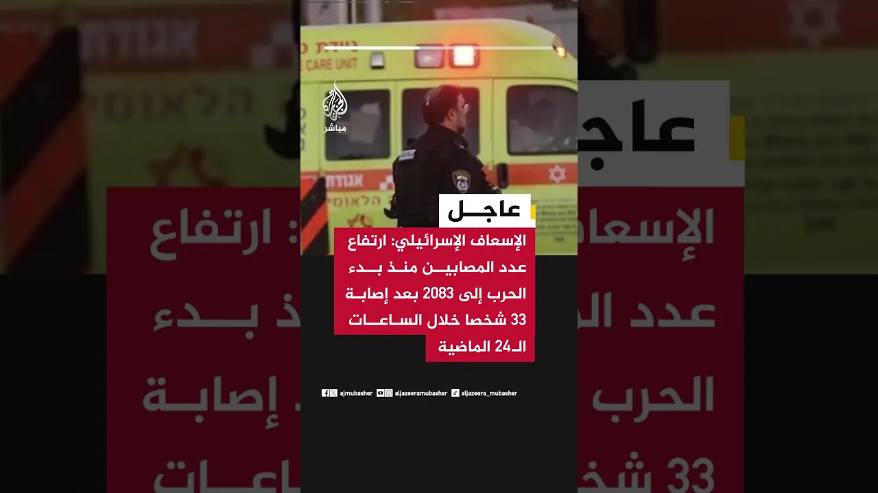 عاجل | الإسعاف الإسرائيلي: ارتفاع عدد المصابين منذ بدء الحرب إلى 2083 بعد إصابة 33 شخصا خلال الساعات الـ24 الماضية