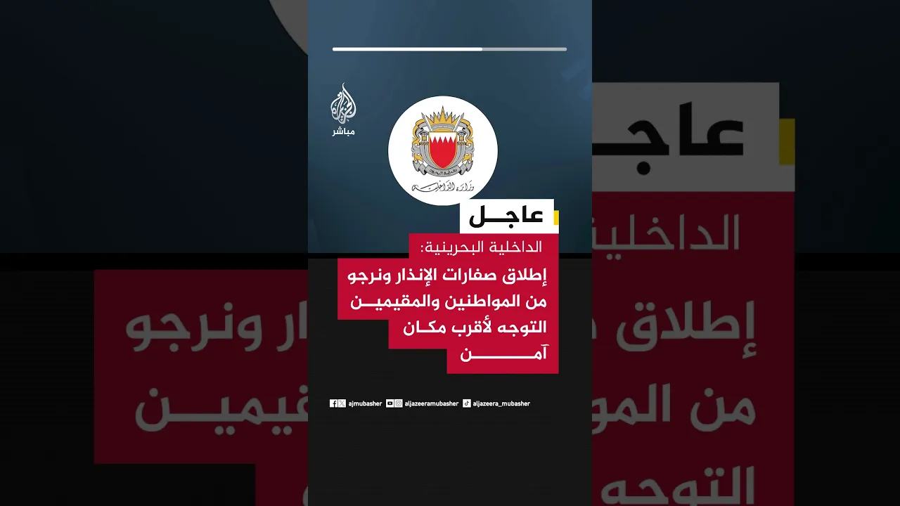 عاجل | الداخلية البحرينية: إطلاق صفارات الإنذار وعلى المواطنين والمقيمين الهدوء والتوجه لأقرب مكان آمن