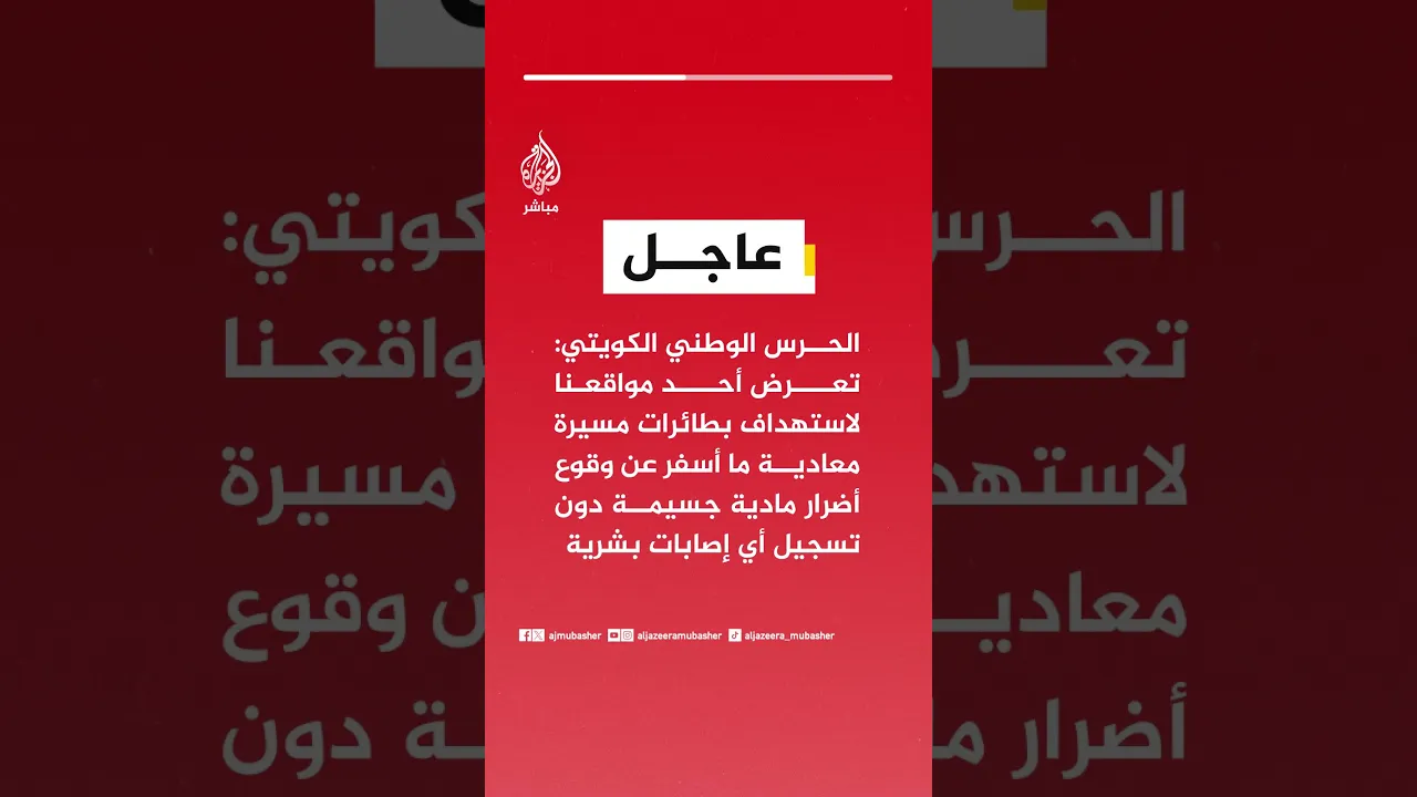 الحرس الوطني الكويتي: تعرض أحد مواقعنا لاستهداف بطائرات مسيرة معادية ما أسفر عن وقوع أضرار مادية جسيمة دون تسجيل أي إصابات بشرية
