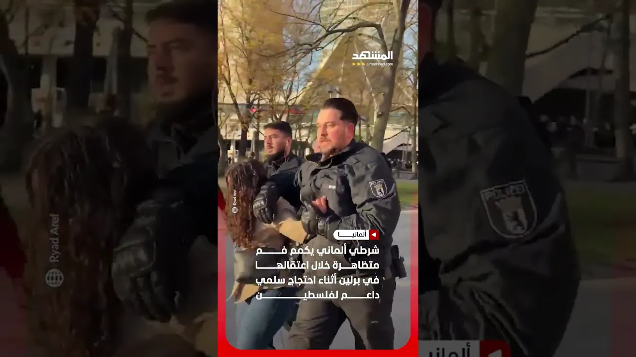 شرطي يكمم فم متظاهرة داعمة لفلسطين يثير جدلاً في برلين #اخبار_المشهد #ألمانيا #المشهد