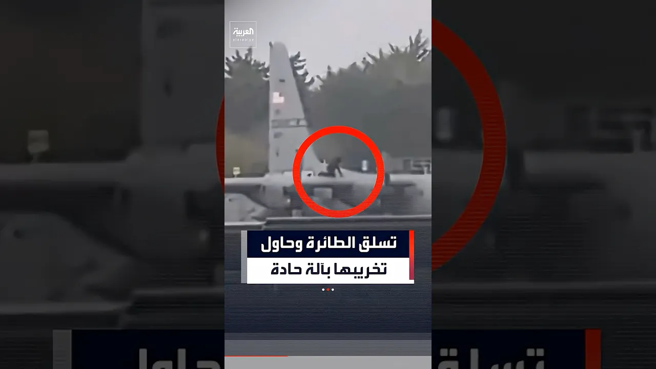 لحظة اقتحام رجل لمدرج مطار شنون وتخريب طائرة عسكرية من طراز C-130 هيركليز