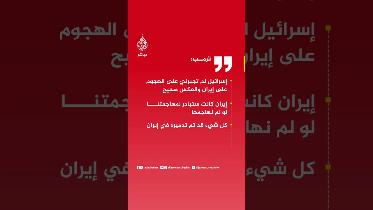 عاجل | #ترامب: إسرائيل لم تجبرني على الهجوم على #إيران والعكس صحيح