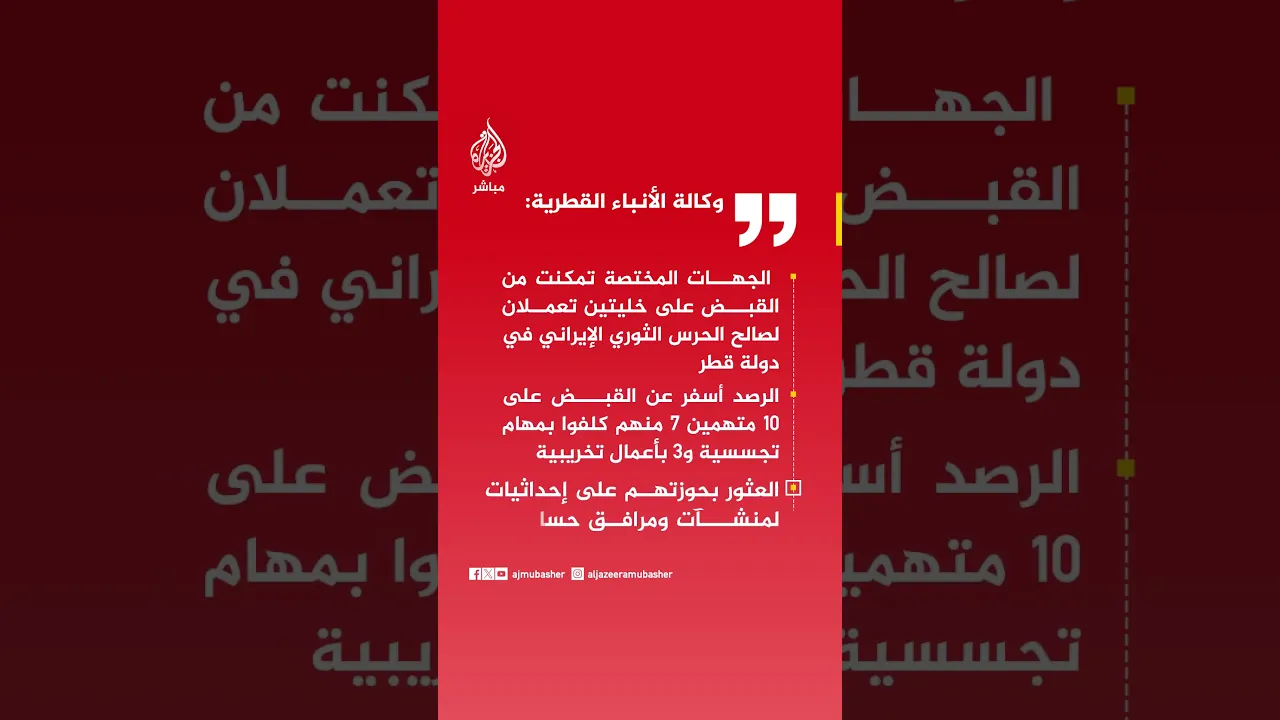 عاجل | وكالة الأنباء القطرية: المتهمون أقروا خلال التحقيقات بارتباطهم بالحرس الثوري وتكليفهم بمهام تجسسية وتخريبية