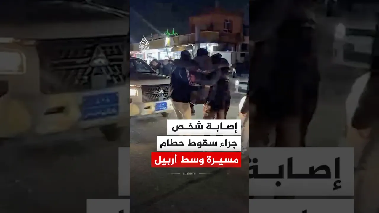 مشاهد توثق إصابة شخص جراء سقوط حطام طائرة مسيرة وسط مدينة أربيل بإقليم كردستان العراق٬ فيما أفاد مراسل الجزيرة بإصابة شخصين إثر سقوط حطام مسيرة على منطقة سكنية بالمدينة.