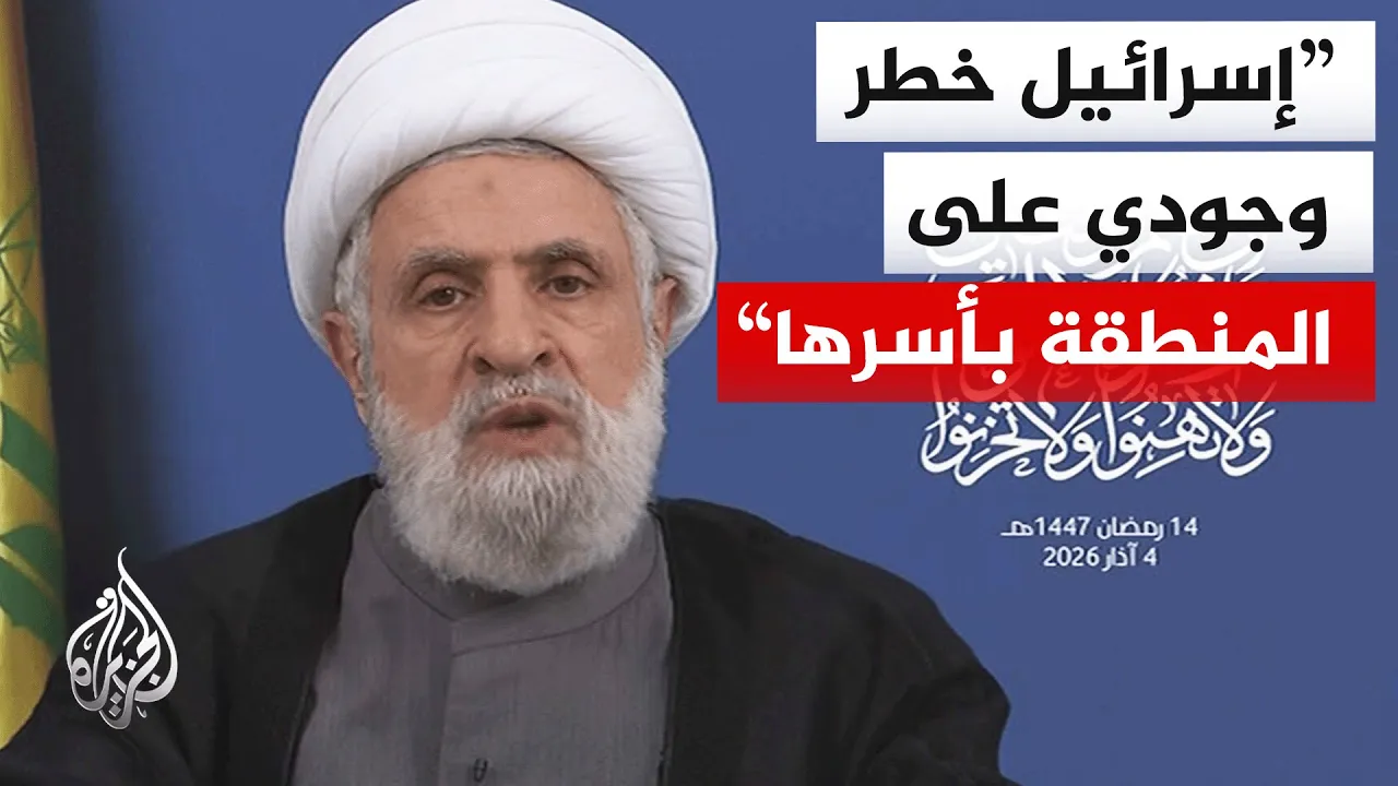 قال الأمين العام لـ حزب الله نعيم قاسم إن إسرائيل قتلت نحو 500 مواطن وارتكبت أكثر من 10 آلاف خرق منذ توقيع اتفاق وقف إطلاق النار، معتبراً أن تل أبيب تسعى إلى فرض قرار سياسي على لبنان، وأن الدفعة الصاروخية الأولى هدفت إلى إسقاط وهم أن العدو سيسكت في حال السكوت عنه. وشدد على أن المشكلة ليست في سلاح حزب الله بل في الاحتلال وخرق السيادة، معتبراً أن إسرائيل تمثل خطراً وجودياً على لبنان والمنطقة، وأن رئيس الوزراء الإسرائيلي بنيامين نتنياهو يسعى إلى مشروع إسرائيل الكبرى.