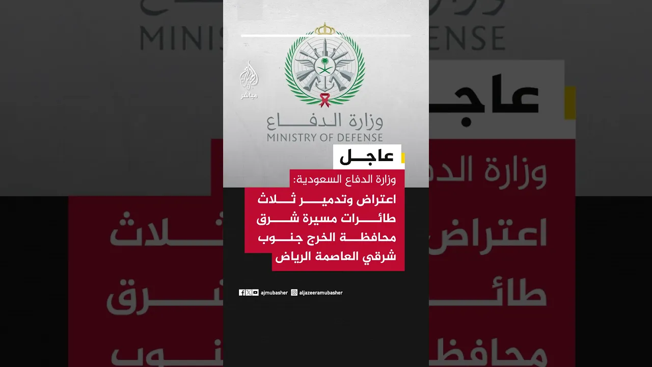 عاجل | وزارة الدفاع السعودية: اعتراض وتدمير ثلاث طائرات مسيرة شرق محافظة الخرج جنوب شرقي العاصمة الرياض