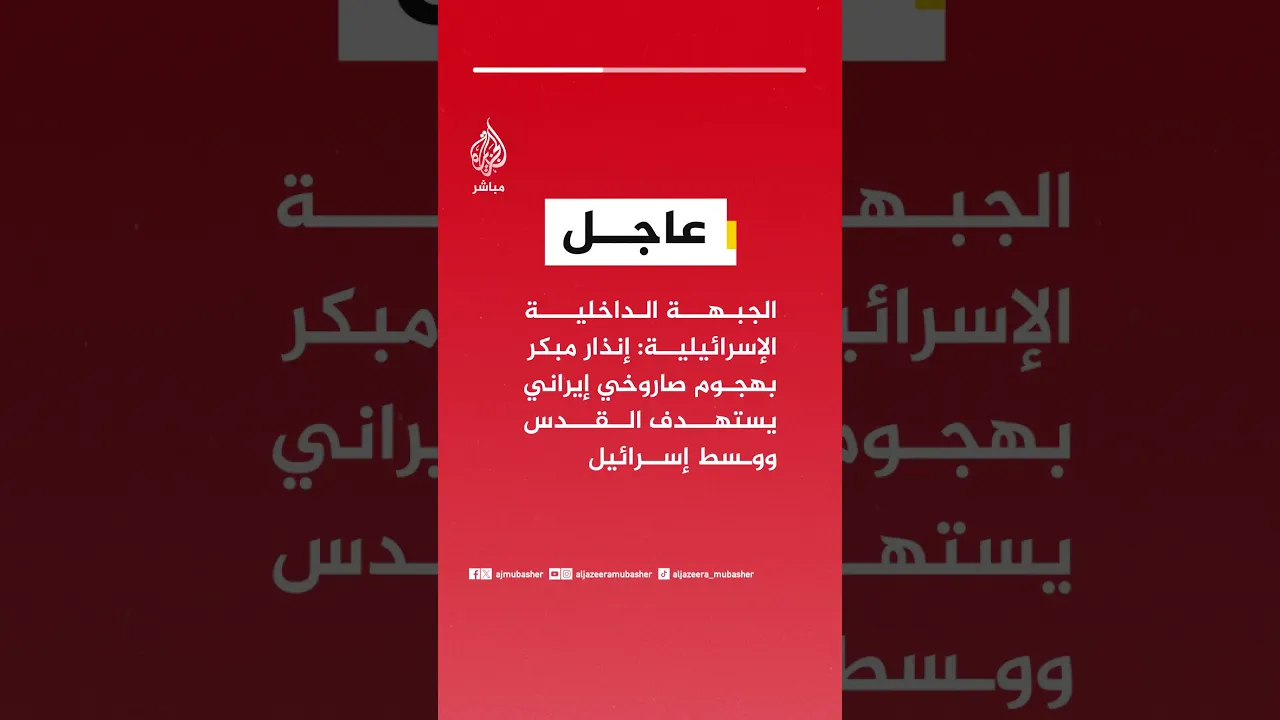عاجل | الجبهة الداخلية الإسرائيلية: إنذار مبكر بهجوم صاروخي إيراني يستهدف #القدس ووسط إسرائيل