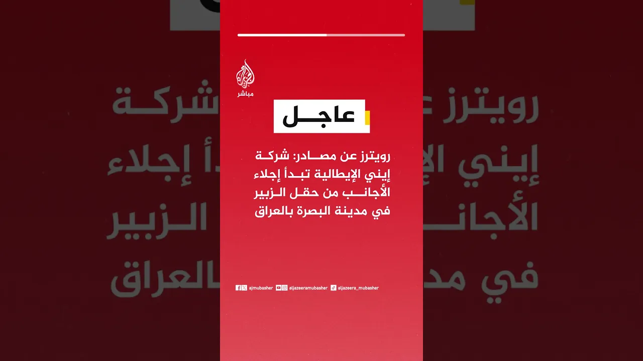 عاجل | رويترز عن مصادر: شركة إيني الإيطالية تبدأ إجلاء الأجانب من حقل الزبير في مدينة البصرة بالعراق