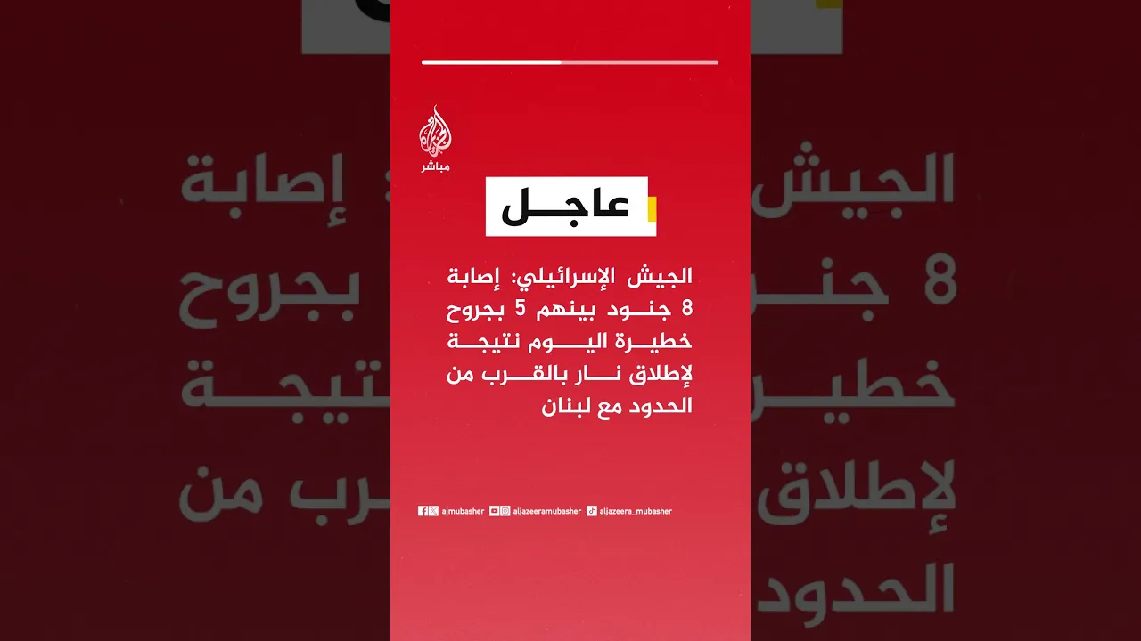 عاجل | الجيش الإسرائيلي: إصابة 8 جنود بينهم 5 بجروح خطيرة اليوم نتيجة لإطلاق نار بالقرب من الحدود مع لبنان