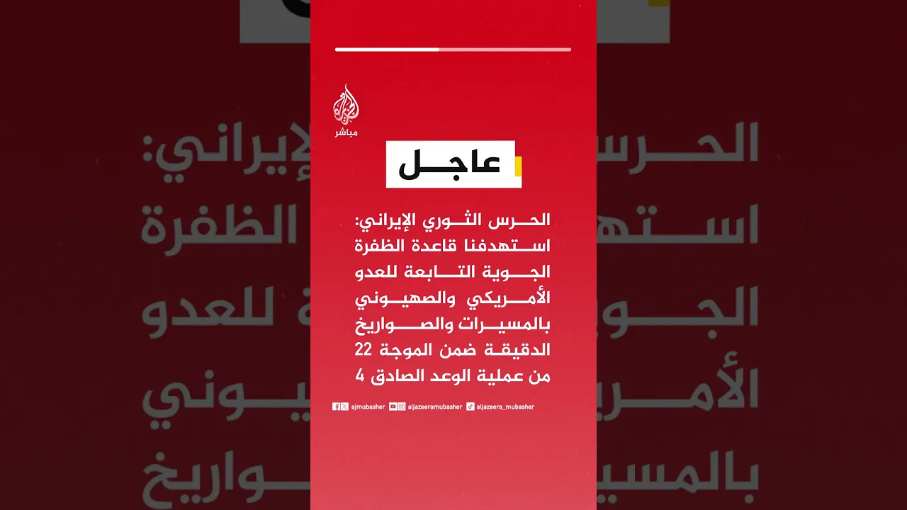 عاجل | الحرس الثوري الإيراني: استهدفنا قاعدة الظفرة الجوية التابعة للعدو الأمريكي والصهيوني بالمسيرات والصواريخ الدقيقة ضمن الموجة 22 من عملية الوعد الصادق 4