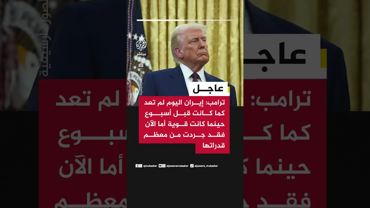 عاجل | ترامب: إيران اليوم لم تعد كما كانت قبل أسبوع حينما كانت قوية أما الآن فقد جردت من معظم قدراتها
