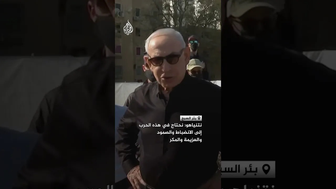 رئيس الوزراء الإسرائيلي بنيامين نتنياهو يقول إنه معجب بصمود المواطنين الإسرائيليين مؤكدا أن إسرائيل تحتاج في هذه الحرب إلى الانضباط والصمود والعزيمة والمكر وذلك خلال تفقده موقع سقوط صاروخ في مدينة بئر السبع.