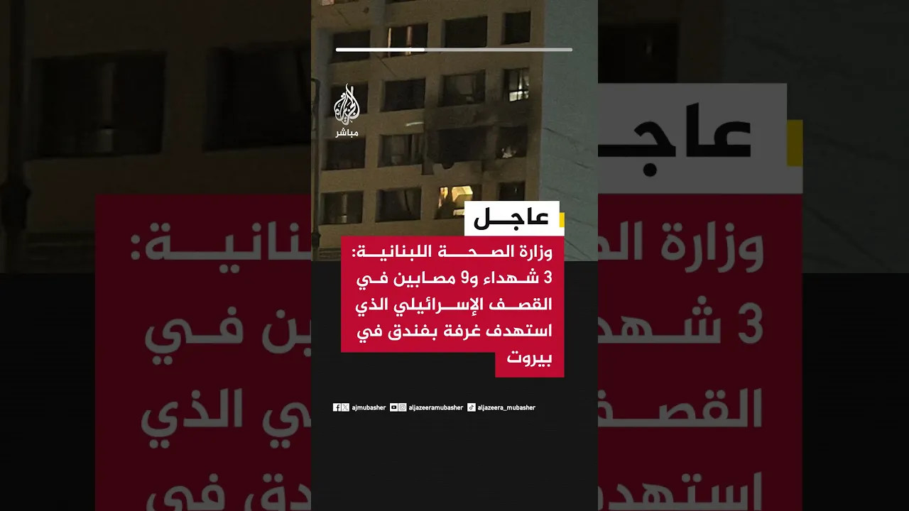 عاجل | وزارة الصحة اللبنانية: 3 شهداء و9 مصابين في القصف الإسرائيلي الذي استهدف غرفة في فندق بالعاصمة بيروت