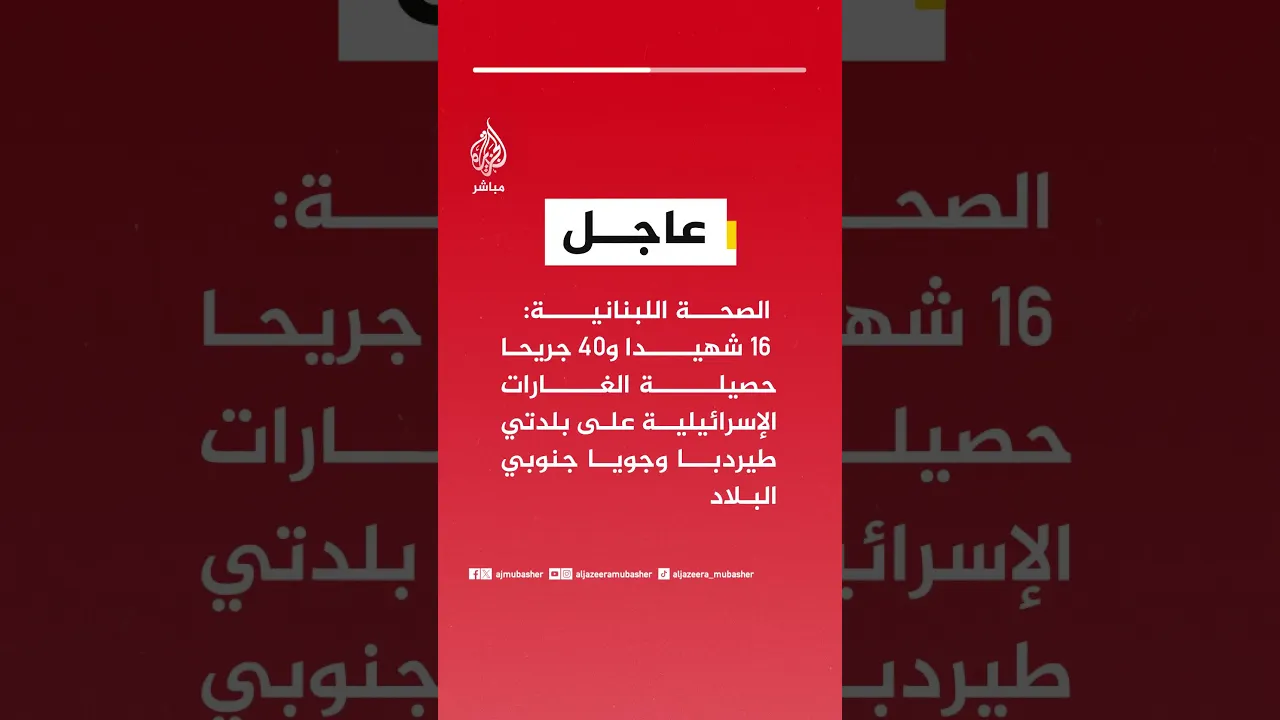 عاجل | الصحة اللبنانية: 16 شهيدا و40 جريحا حصيلة الغارات الإسرائيلية على بلدتي طيردبا وجويا جنوبي البلاد