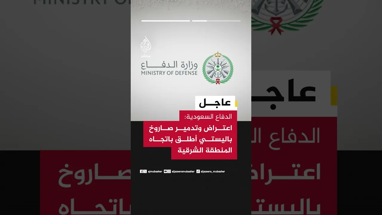 وزارة الدفاع السعودية: اعتراض وتدمير صاروخ باليستي أطلق باتجاه المنطقة الشرقية
