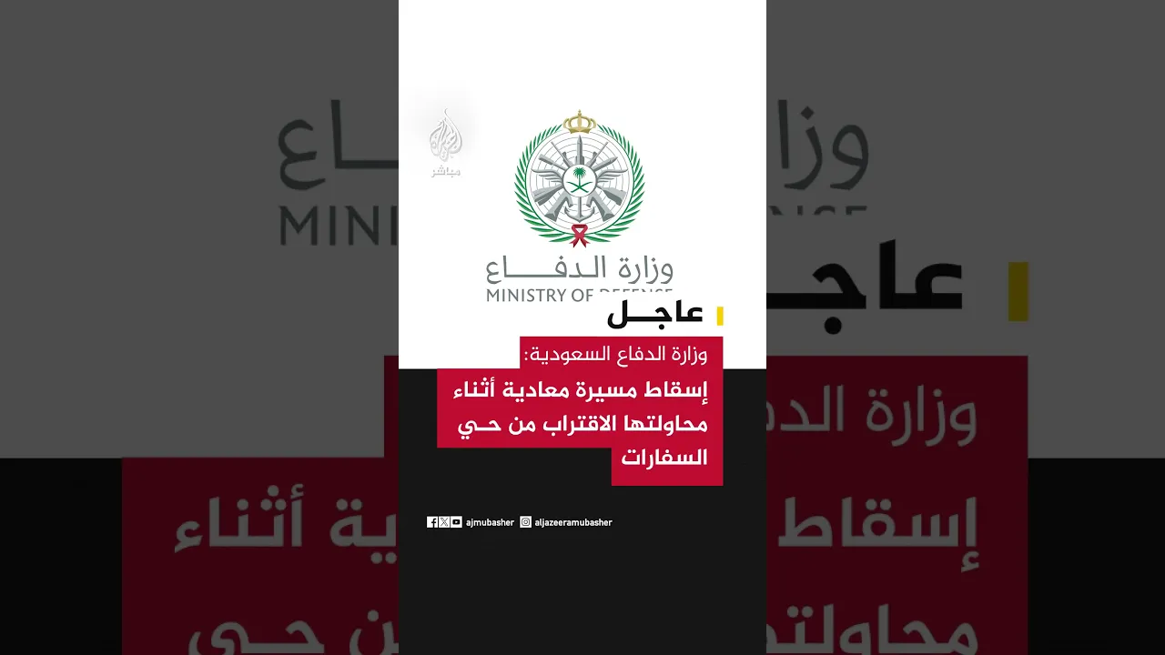عاجل | وزارة الدفاع السعودية: إسقاط مسيرة معادية أثناء محاولتها الاقتراب من حي السفارات