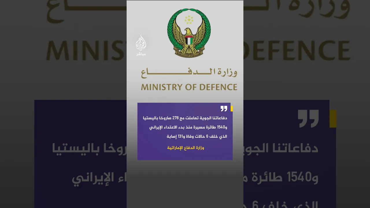 عاجل | الدفاع الإماراتية: دفاعاتنا الجوية تعاملت مع 278 صاروخا باليستيا و1540 طائرة مسيّرة منذ بدء الاعتداء الإيراني الذي خلف 6 حالات وفاة و131 إصابة
