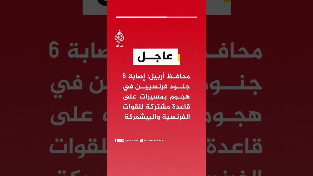 عاجل | محافظ أربيل: إصابة 6 جنود فرنسيين في هجوم بمسيرات على قاعدة مشتركة للقوات الفرنسية والبيشمركة