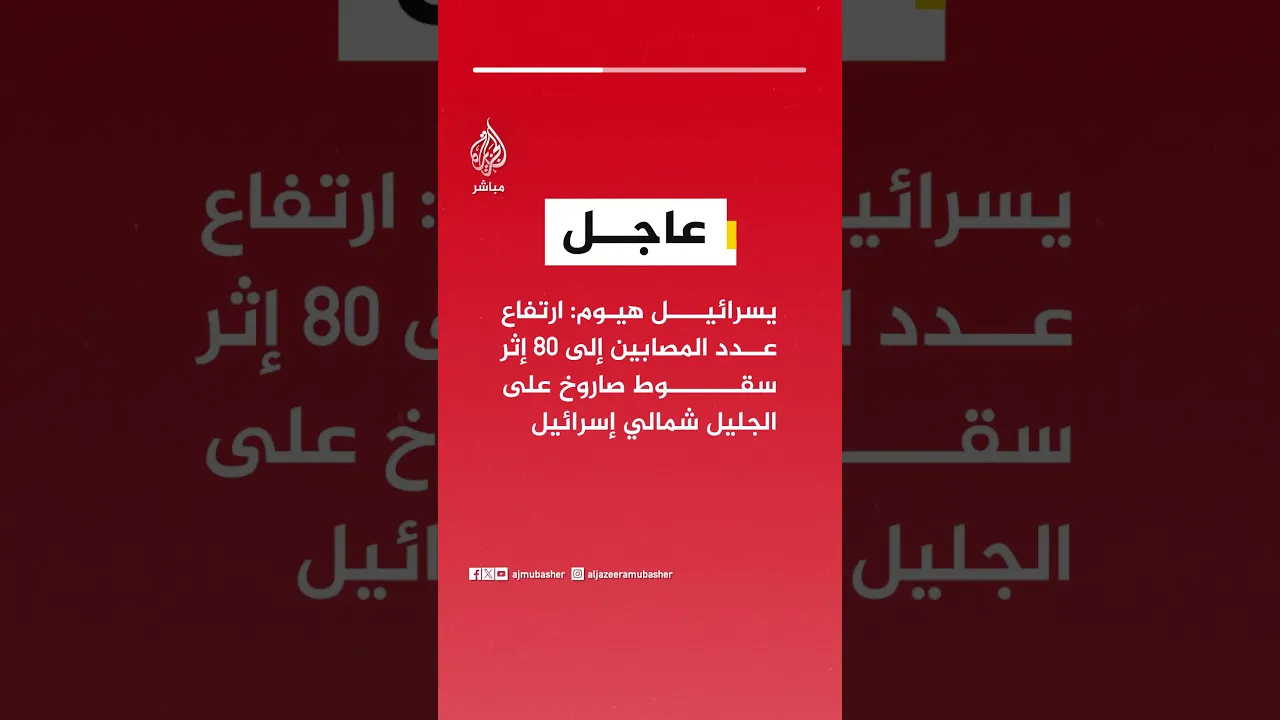 عاجل | يسرائيل هيوم: ارتفاع عدد المصابين إلى 80 إثر سقوط صاروخ على الجليل شمالي إسرائيل